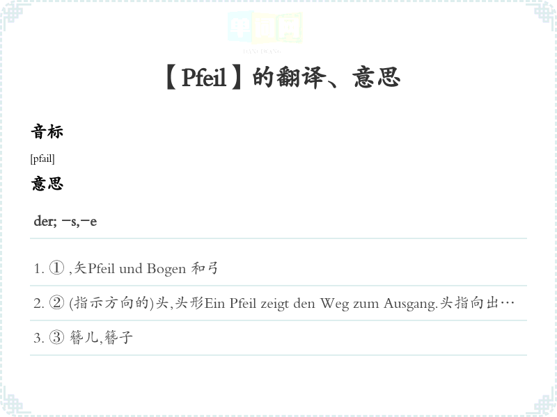 ② (指示方向的)头,头形Ein Pfeil zeigt den Weg zum Ausgang.头指向出口的路。