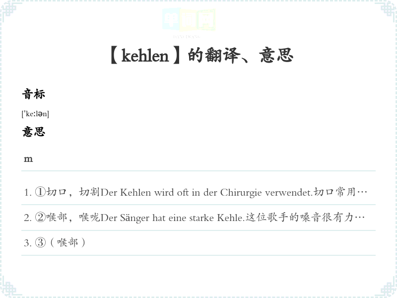 ①切口,切割Der Kehlen wird oft in der Chirurgie verwendet.切口常用于外科手术。