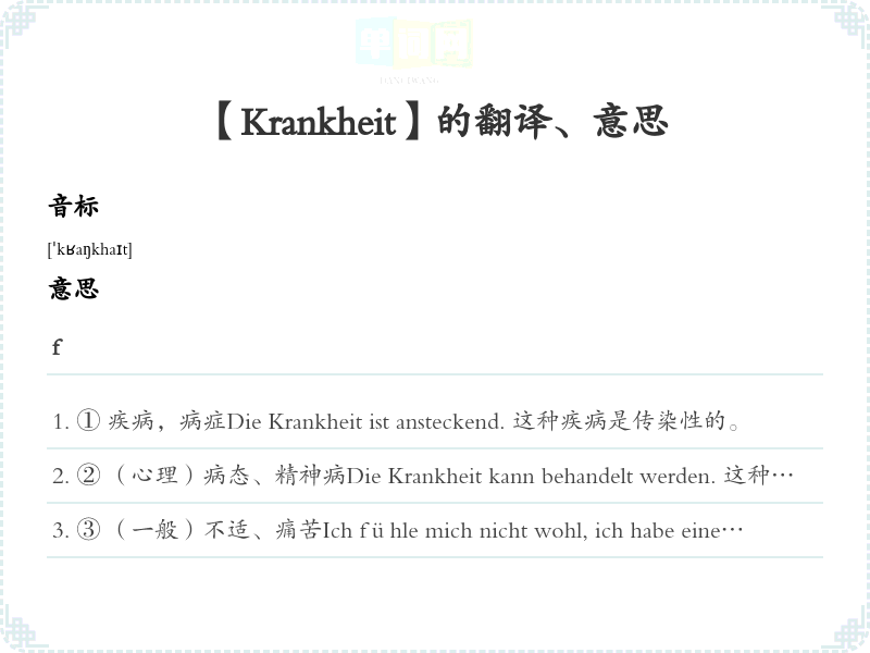 ① 疾病,病症Die Krankheit ist ansteckend. 这种疾病是传染性的。