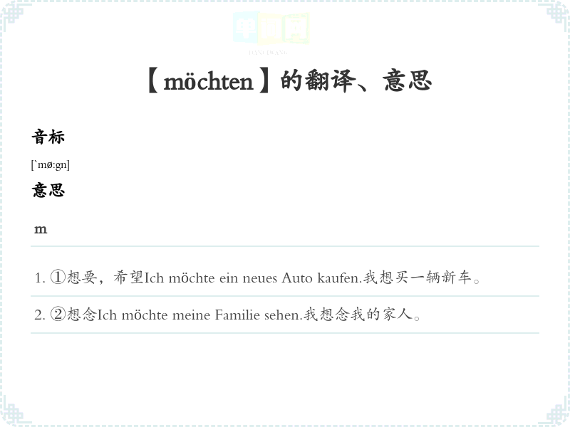 ①想要,希望Ich möchte ein neues Auto kaufen.我想买一辆新车。