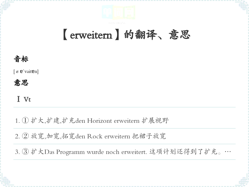 扩展,延伸Der Tunnel erweitert sich zum Ausgang hin. 隧道向出口扩展。Ⅲ erweitert P.Ⅱ扩展的,扩大的Sein Herz ist erweitert. 他的心脏扩大了。语法搭配sich+四格, +四格, um+四格