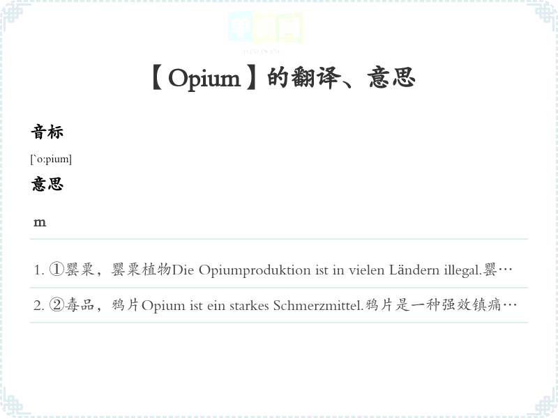 ②毒品,鸦片Opium ist ein starkes Schmerzmittel.鸦片是一种强效镇痛药。