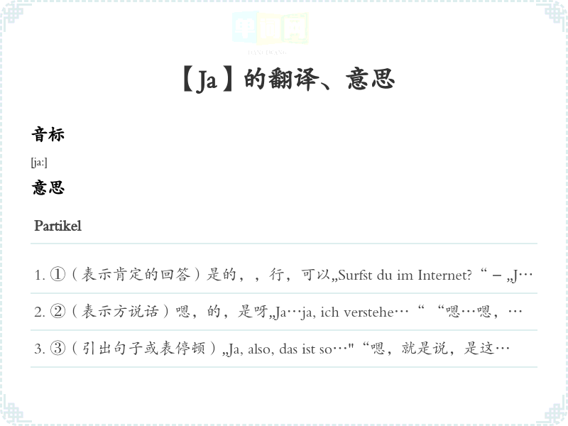 ⑦(强调下文更进一步的意)甚至,连…也…ja (sogar)Wir waren alle schrecklich wütend, ja sogar mein Vater, der sonst immer ganz ruhig bleibt!我们大家都气坏了,就连我爸爸这个平时很冷静的人也是气得不得了呢!