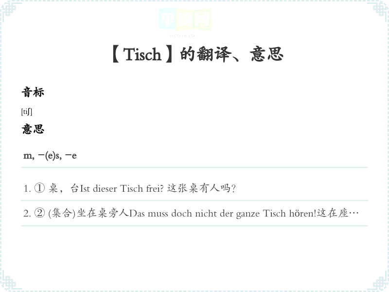 ② (集合)坐在桌旁人Das muss doch nicht der ganze Tisch hören!这在座人都听!Bitte zu Tisch, das Essen ist fertig!请入席,饭菜已就绪!