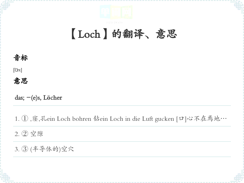 ① ,窿,孔ein Loch bohren 钻ein Loch in die Luft gucken [口]心不在焉地凝视着ein Loch in die Luft schießen [口]未击中,未射中