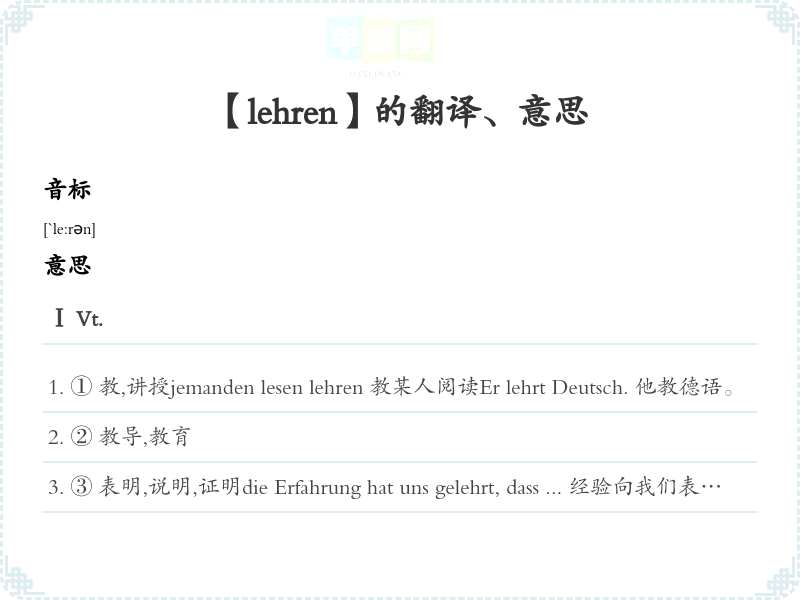 ③ 表明,说明,证明die Erfahrung hat uns gelehrt, dass ... 经验向我们表明...Ⅱ Vi.教书。教课。an der Universität lehren 在大学里教书in den oberen Klassen lehren 在高年级教书语法搭配+四格, +三格