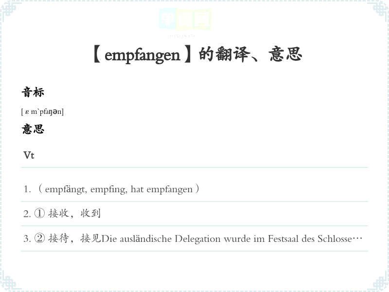 ② 接待,接见Die ausländische Delegation wurde im Festsaal des Schlosses empfangen.外国代表团在宫殿宴会厅里受到接见。