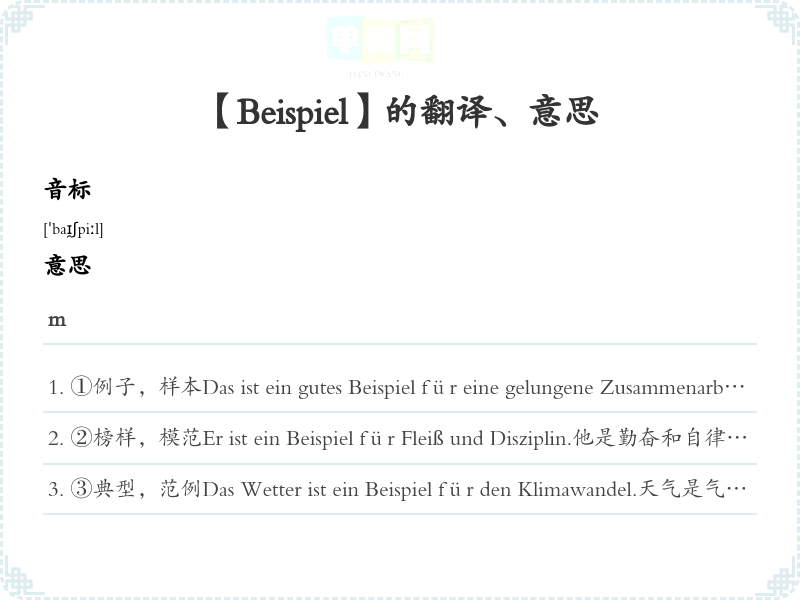 ②榜样,模范Er ist ein Beispiel für Fleiß und Disziplin.他是勤奋和自律的榜样。