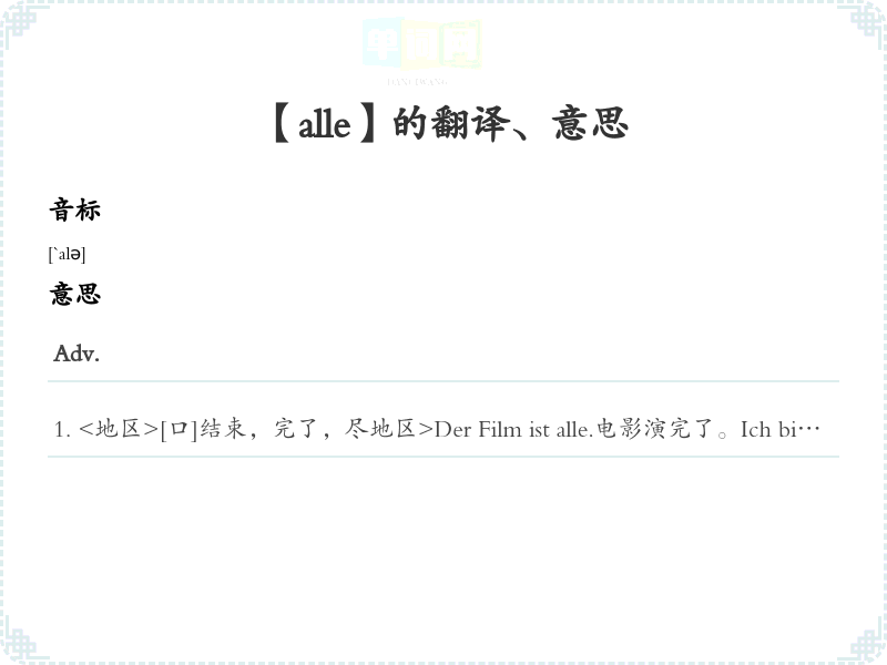 <地区>[口]结束,完了,尽地区>Der Film ist alle.电影演完了。Ich bin ganz alle.我累得要死。Du kannst den Kuchen ruhig alle machen.你就把这点心吃了吧。Indefinit pronomen. 不定代词 见all
