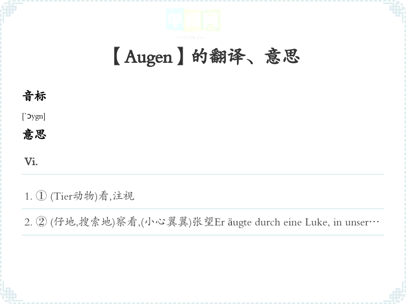 ② (仔地,搜索地)察看,(小心翼翼)张望Er äugte durch eine Luke, in unsere Richtung.他透过小窗我们的方看。语法搭配+四格