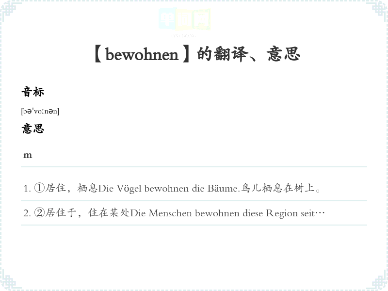 ②居住于,住在某处Die Menschen bewohnen diese Region seit Jahrhunderten.人们在这个地区居住了几个世纪。