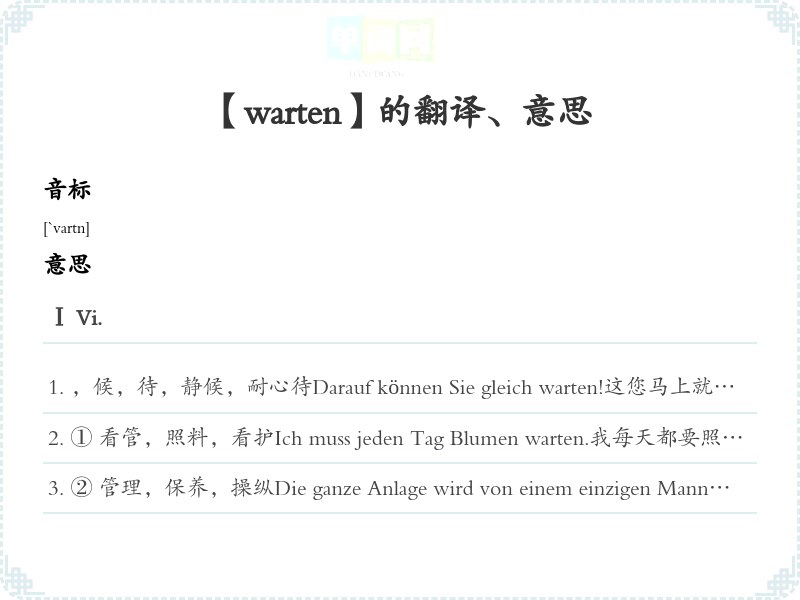 ,候,待,静候,耐心待Darauf können Sie gleich warten!这您马上就能到的!(不久)Kann ich gleich auf Antwort warten?我可以立答复吗?Wie lange soll ich noch warten?我还该多久呢?Ⅱ Vt.