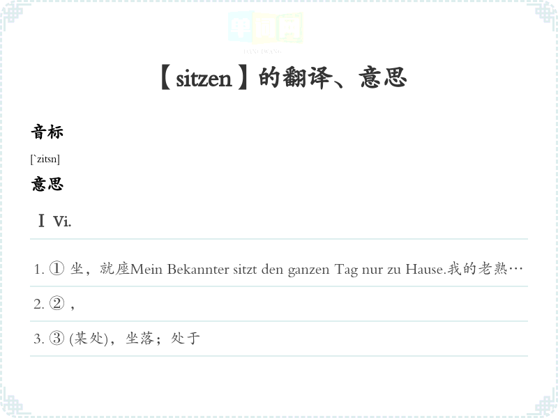 ① 坐,就座Mein Bekannter sitzt den ganzen Tag nur zu Hause.我的老熟人一整天都只是坐家。Sie sitzt mit übergeschlagenen Beinen im Sessel.她翘着二郎腿坐沙发。