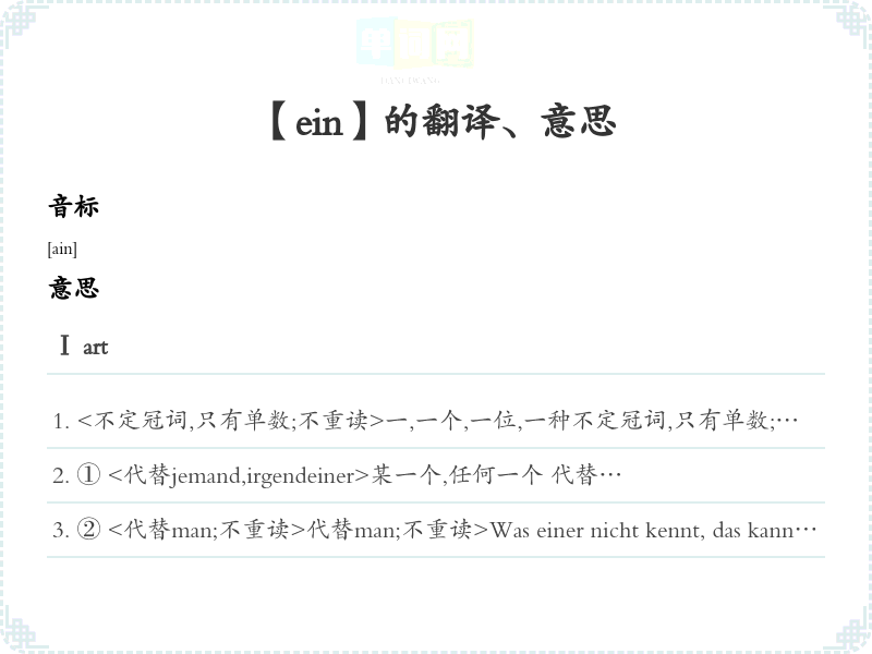 ⑤ <与der andere互相关联;重读="">与der>Sie stören einer den anderen. 他们相互干扰。Ⅲ num<基数词:重读>一,一个基数词:重读>ein Drittel, Viertel 三、四分之一Es ist ein Unr. 现在是一点钟。IV adv<只用于短语>进去,进来只用于短语>
