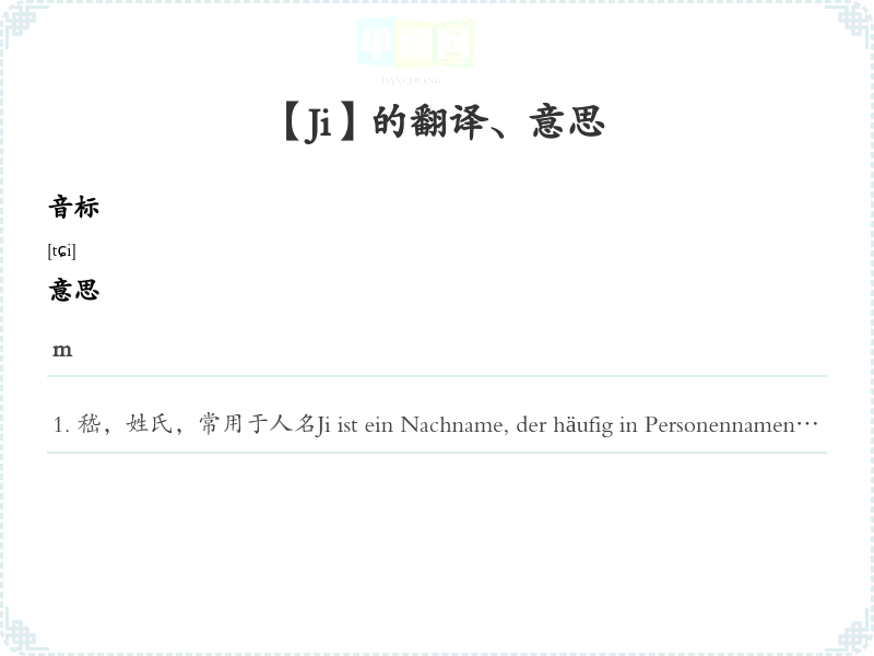 嵇,姓氏,常用于人名Ji ist ein Nachname, der häufig in Personennamen vorkommt。嵇的含义是高大的山,常用于古代诗词中。Ji bedeutet ein hoher Berg und wird oft in alten Gedichten verwendet。