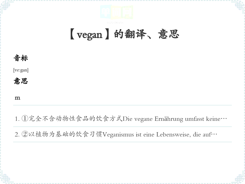 ①完全不含动物性食品的饮食方式Die vegane Ernährung umfasst keine tierischen Produkte.完全不含动物性食品的饮食方式。