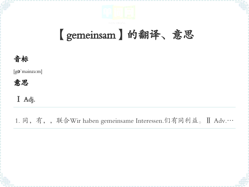 同,有,,联合Wir haben gemeinsame Interessen.们有同利益。Ⅱ Adv.同,一起Das Buch gehört uns gemeinsam.这本书是们同。