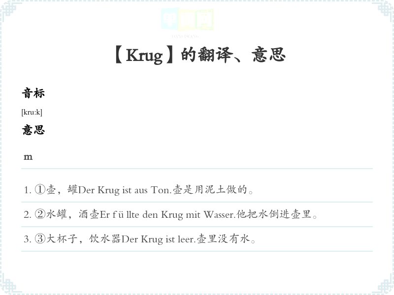 ②水罐,酒壶Er füllte den Krug mit Wasser.他把水倒进壶里。