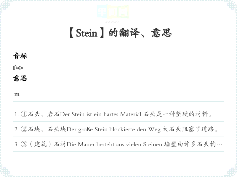 ①石头,岩石Der Stein ist ein hartes Material.石头是一种坚硬的材料。