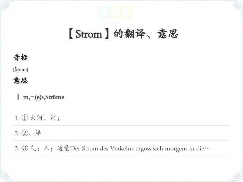 ③ 气;人;通量Der Strom des Verkehrs ergoss sich morgens in die Innenstadt.早晨汽车入市区。mit dem Strom schwimmen随大gegen/wider dem Strom schwimmen逆潮,不随大Ⅱ m,-(e)s, nur Sg,den Strom einschalten, abschalten, ausschalten开通,切断,关闭etw. steht unter Strom某物带,某物有Als er den Fernseher reparierte, bekam er einen Schlag, weil die Rückwand unter Strom stand.在修理视机时候被了一下,因为后线路板带。