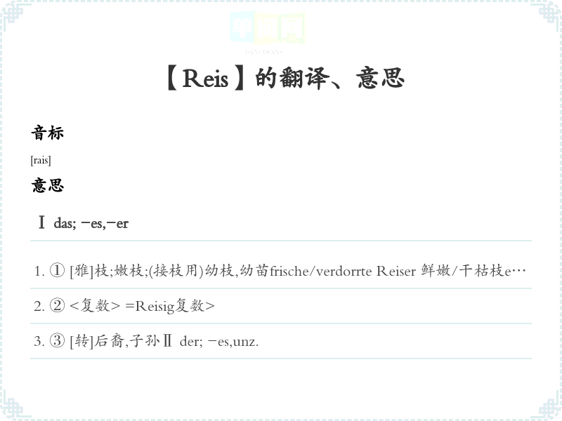 ① [雅]枝;嫩枝;(接枝用)幼枝,幼苗frische/verdorrte Reiser 鲜嫩/干枯枝ein Bündel Reiser 一束枯枝Viele Reiser machen einen Besen. [谚]集枝成帚。