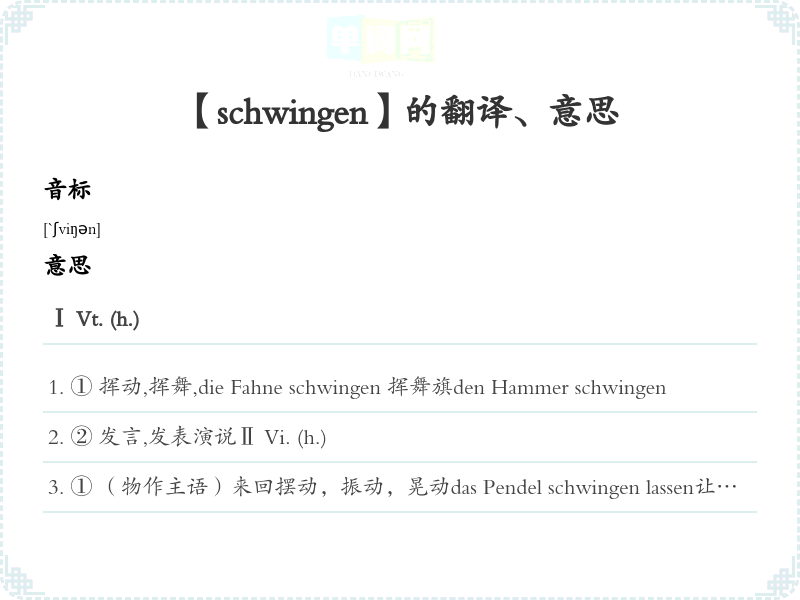 ① (物作主语)来回摆动,振动,晃动das Pendel schwingen lassen让钟摆来回摆动Lampions schwingen im Wind.灯笼在空中摇摆。