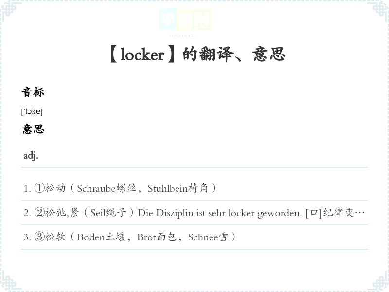 ②松弛,紧(Seil绳子)Die Disziplin ist sehr locker geworden. [口]纪律变得很松弛。