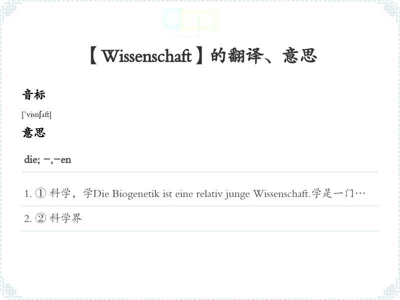 ① 科学,学Die Biogenetik ist eine relativ junge Wissenschaft.学是一门新兴学科。