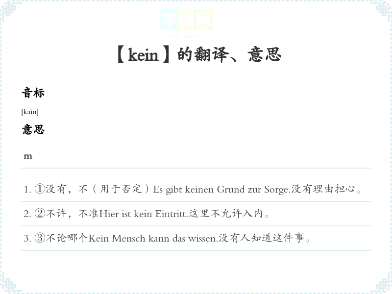 ①没有,不(用于否定)Es gibt keinen Grund zur Sorge.没有理由担心。
