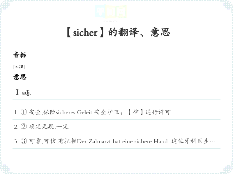 ③ 可靠,可信,有把握Der Zahnarzt hat eine sichere Hand. 这位牙科医生手艺好。
