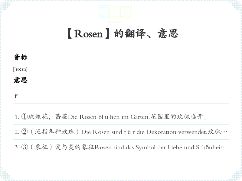 ③(象征)爱与美的象征Rosen sind das Symbol der Liebe und Schönheit.玫瑰是爱情与美的象征。