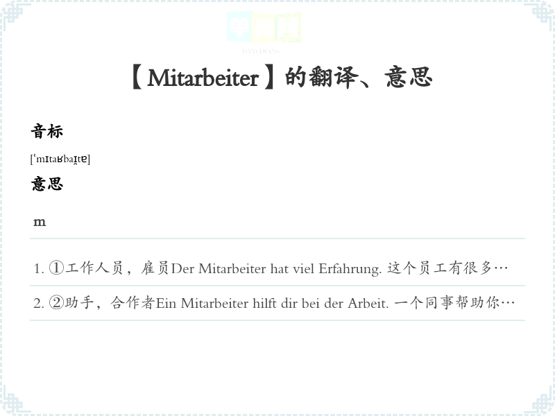 ①工作人员,雇员Der Mitarbeiter hat viel Erfahrung. 这个员工有很多经验。
