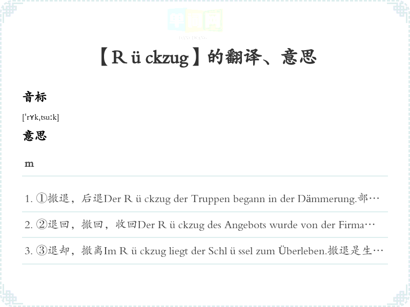 ③退却,撤离Im Rückzug liegt der Schlüssel zum Überleben.撤退是生存的关键。