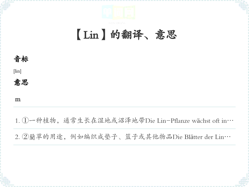 ①一种植物,通常生长在湿地或沼泽地带Die Lin-Pflanze wächst oft in feuchten Gebieten.这种藺草通常生长在潮湿的地方。
