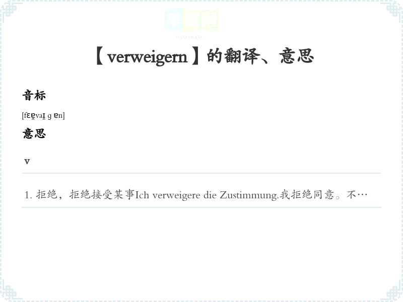 拒绝,拒绝接受某事Ich verweigere die Zustimmung.我拒绝同意。不予理会,拒绝回应Er hat die Anfrage verweigert.他拒绝了请求。(法律用语)拒绝提供证据Die Zeugin verweigerte die Aussage.证人拒绝作证。