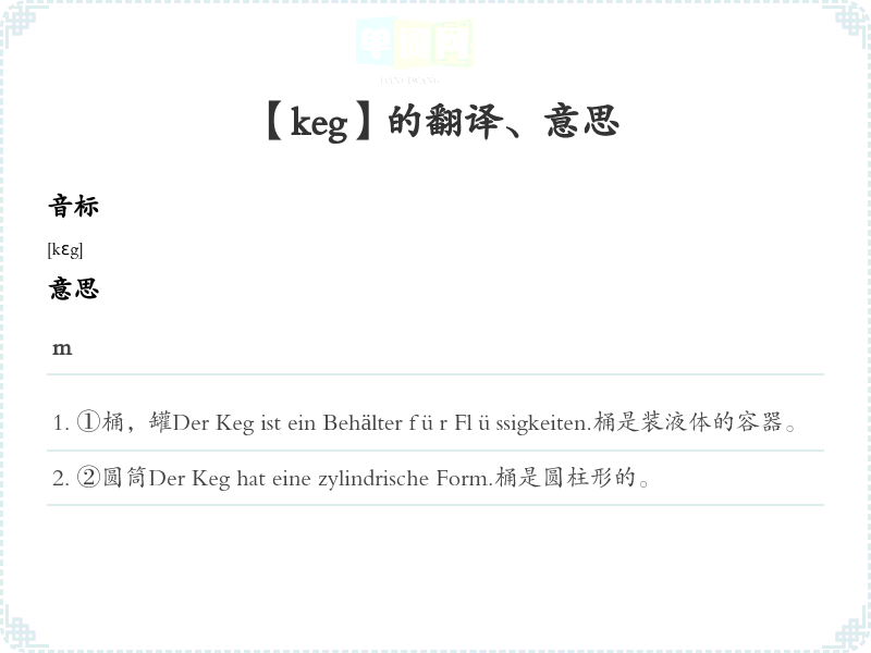 ①桶,罐Der Keg ist ein Behälter für Flüssigkeiten.桶是装液体的容器。