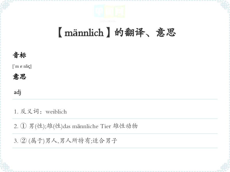 ③ 男子气概,雄赳赳,刚强Sie findet Männer mit Bart sehr männlich.她觉得带胡须男子特别有男子气概。