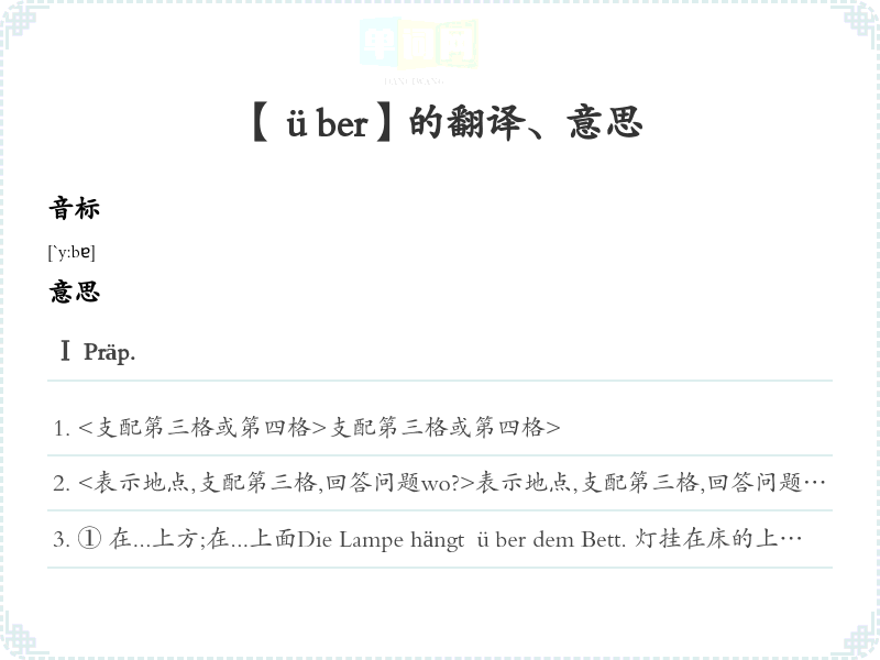② 在...期间etwa. über Mittag tun 在中午时间内做某事⒋<表示时间,支配第三格> 在...时候表示时间,支配第三格>Über der Arbeit vergaß er die Zeit. 他在工作中忘了时间。⒌<表示超过某一界限,支配第四格>过表示超过某一界限,支配第四格>Städte von über 100000 Einwohner 人口万上的城市⒍<表示课题、对象,支配第四格>关于表示课题、对象,支配第四格>ein Aufsatz über Goethe 关于歌德的一篇文章über ein Thema sprechen 讲一个课题⒎<表示对人或物的关系,支配第三格或第四格>高于,优于表示对人或物的关系,支配第三格或第四格>über jmdm. stehen 职位高于某人über einer Situation stehen [转]制局面⒏<表示手段、工具,支配第四格>通过(通讯途径等)表示手段、工具,支配第四格>ein Telegramm über Fernschreiber aufgeben 通过电传打字电报机发送电报⒐<表示原因,支配第三格>由于表示原因,支配第三格>Über dem Lärm wachte er auf. 他被吵醒了。⒑<连接两个相同的名词,表示积聚、重复,支配第四格> 连接两个相同的名词,表示积聚、重复,支配第四格>einmal über das andere 一而再,再而三In seiner Arbeit sind Fehler über Fehler. 他的作业中错误不断。⒒<受某些动词、形容词、名词的支配,支配第四格>受某些动词、形容词、名词的支配,支配第四格>über etwa.(A.) klagen 抱怨某事Ⅱ adv.