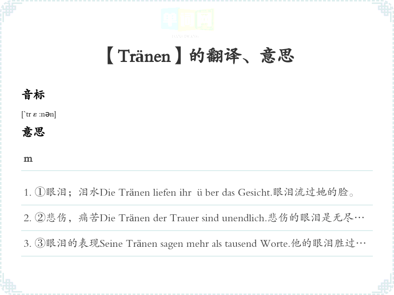 ①眼泪;泪水Die Tränen liefen ihr über das Gesicht.眼泪流过她的脸。