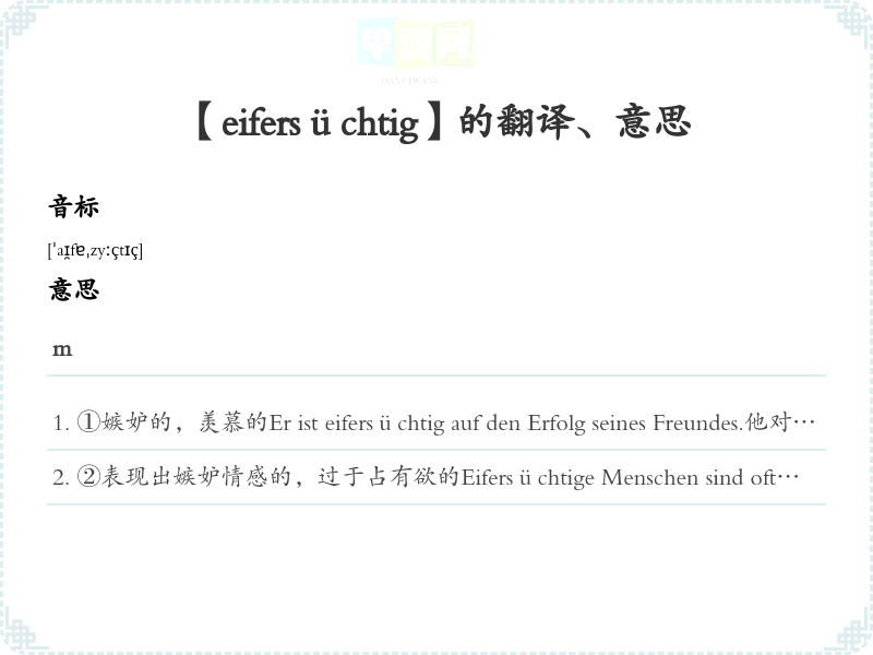 ①嫉妒的,羡慕的Er ist eifersüchtig auf den Erfolg seines Freundes.他对朋友的成功感到嫉妒。