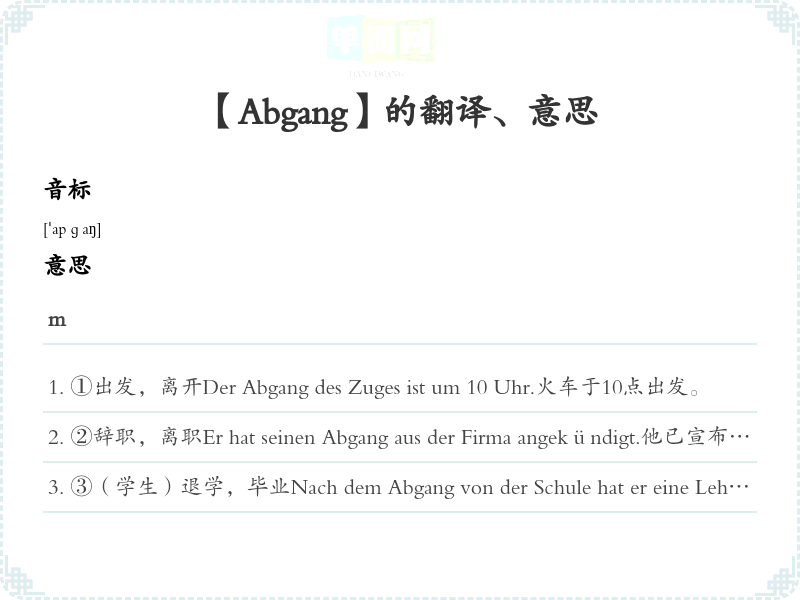 ②辞职,离职Er hat seinen Abgang aus der Firma angekündigt.他已宣布离开公司。