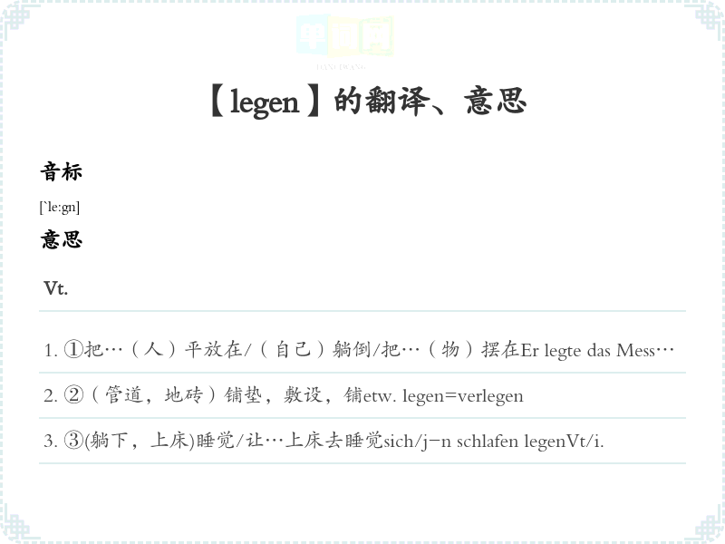 ①(物主)减弱,缓和,平息Nachdem sich der Sturm gelegt hatte, fuhren sie auf den See hinaus.风暴平息后,他们驾艇到湖上去了。etwas an den Tag legen显示出做某事auf A legen 重视sich(Akk.) ins Zeug legen使劲jmdn. aufs Kreuz legen欺诈sich(Akk.) ins gemachte Bett legen坐享其成sich(Akk.) mächtig ins Zeug legen 干,再接再厉die Hände in den Schoß legen无所事事Das Huhn, das goldene Eier legt, schlachten.竭泽而渔。Die Gans, die goldene Eier legt, schlachten.竭泽而渔。语法搭配sich+四格, +四格, in+四格, auf+四格, hinter+四格, zwischen+四格, neben+四格, über+四格, unter+四格 德 语 助 手
