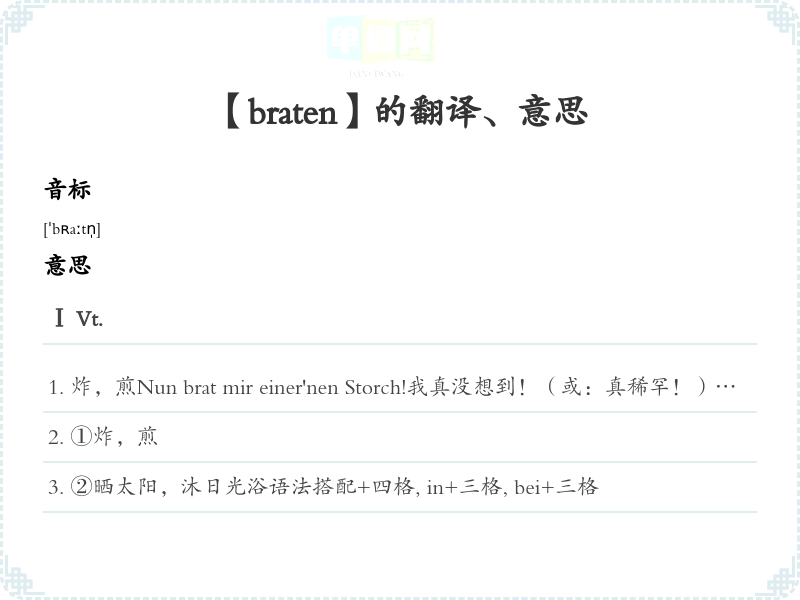 炸,煎Nun brat mir einer'nen Storch!我真没想到!(或:真稀罕!)(表惊讶或愤怒)Ⅱ Vi.