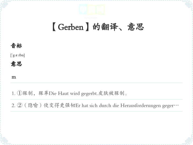 ①鞣制,鞣革Die Haut wird gegerbt.皮肤被鞣制。