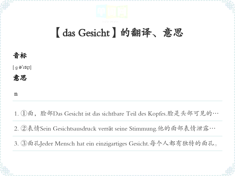 ①面,脸部Das Gesicht ist das sichtbare Teil des Kopfes.脸是头部可见的部分。
