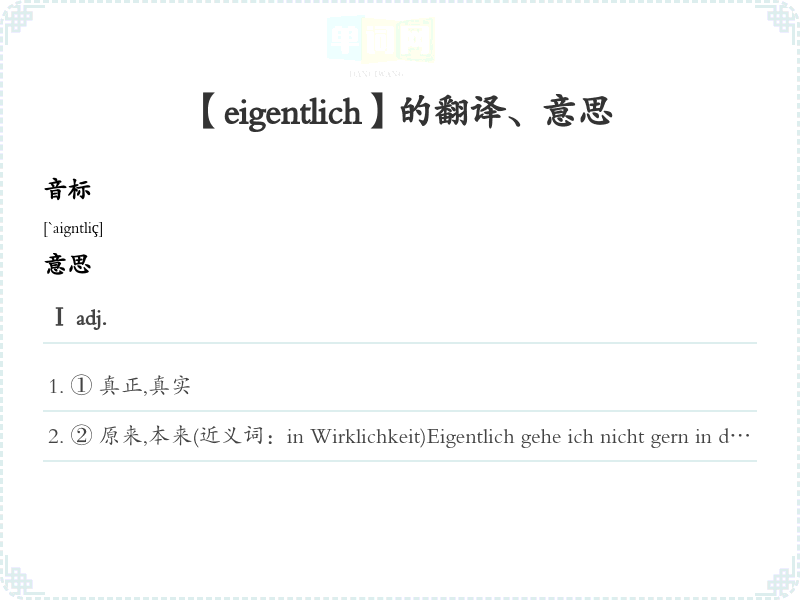 ② 原来,本来(近义词:in Wirklichkeit)Eigentlich gehe ich nicht gern in die Disko.我其实原本想去舞厅。Ⅱ adv.其实,究竟,到底,本来Er heißt eigentlich Meyer.他其实叫Meyer.