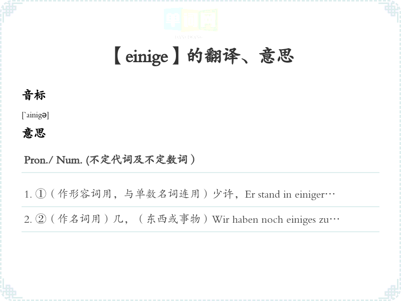 ①(作形容词用,与单数名词连用)少许,Er stand in einiger Entfernung.他在离这儿有段距离的地方站着。(他站在稍远处。)Sie besitzt bereits einige Erfahrungen auf diesem Gebiet.他在这方面已有经验。Das Stück hatte einigen Erfolg.这出戏还算成功。Einiges Geld hatte ich noch.我还有钱。In dem Buch ist einiges Gutes zu finden.这本书里还有精彩的地方。Es sind nur einige Fehler zu verbessern.只有几错误需要改正。Es ist einige Grade kälter als gestern.今天比昨天冷几度。Dieser Student ist einige zwanzig Jahre alt.这大学生十几岁。Der Fall hat einiges Aufsehen erregt.这事件引起了很大的轰动,