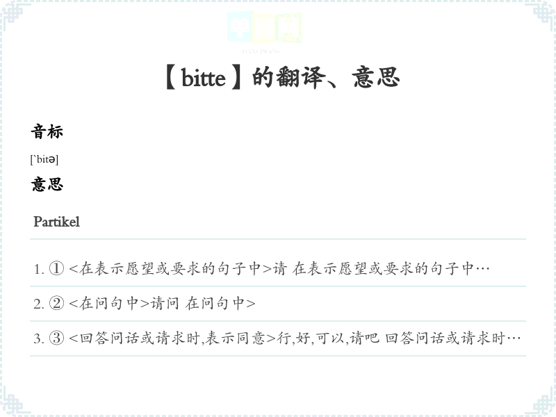 ③ <回答问话或请求时,表示同意>行,好,可以,请吧 回答问话或请求时,表示同意>,,Kann ich das Salz haben?" - ,,Bitte!""可以拿盐吗?""请!"