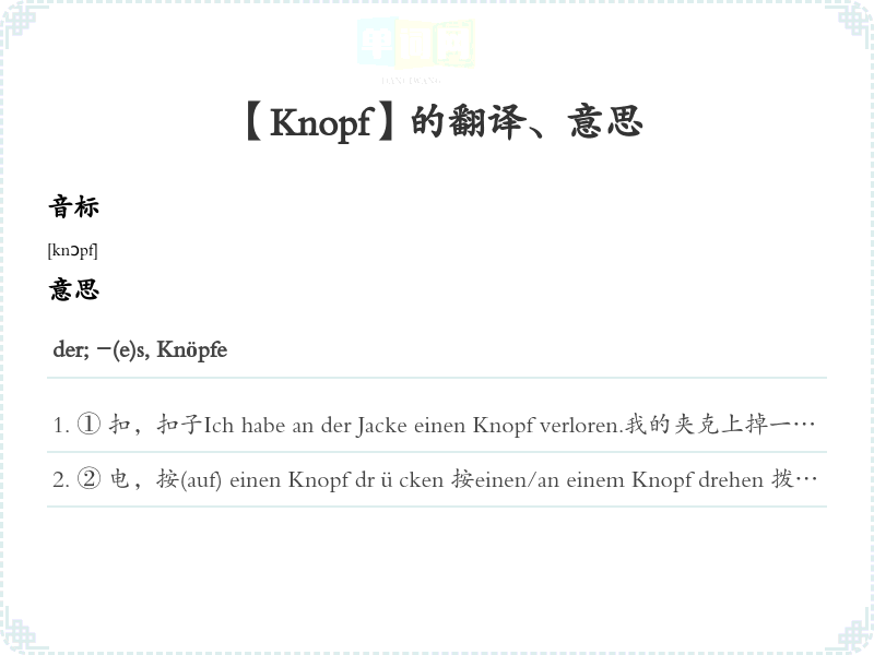 ① 扣,扣子Ich habe an der Jacke einen Knopf verloren.我的夹克上掉一个纽扣。An deinem Hemd ist ein Knopf offen.衬衣上有一个纽扣没扣好。