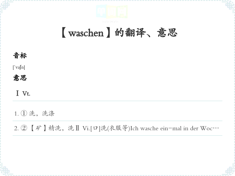 ② 【矿】精洗,洗Ⅱ Vi.[口]洗(衣服等)Ich wasche ein-mal in der Woche. 我每星期洗一次衣服。Ⅲ Vi(s.)【海】,没Die Wogen waschen über das Deck. 大浪甲板。Ⅳ Vr.洗,洗涤Ich wasche mich morgens und abends. 我早晚洗脸(或洗澡)。语法搭配+四格, sich+三格, sich+四格